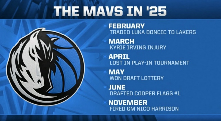 2月 送東契奇去湖人3月 歐文受傷4月 附加賽出局5月 抽到狀元簽6月 選中弗拉格11月 解雇尼科·哈里森2026-01-11